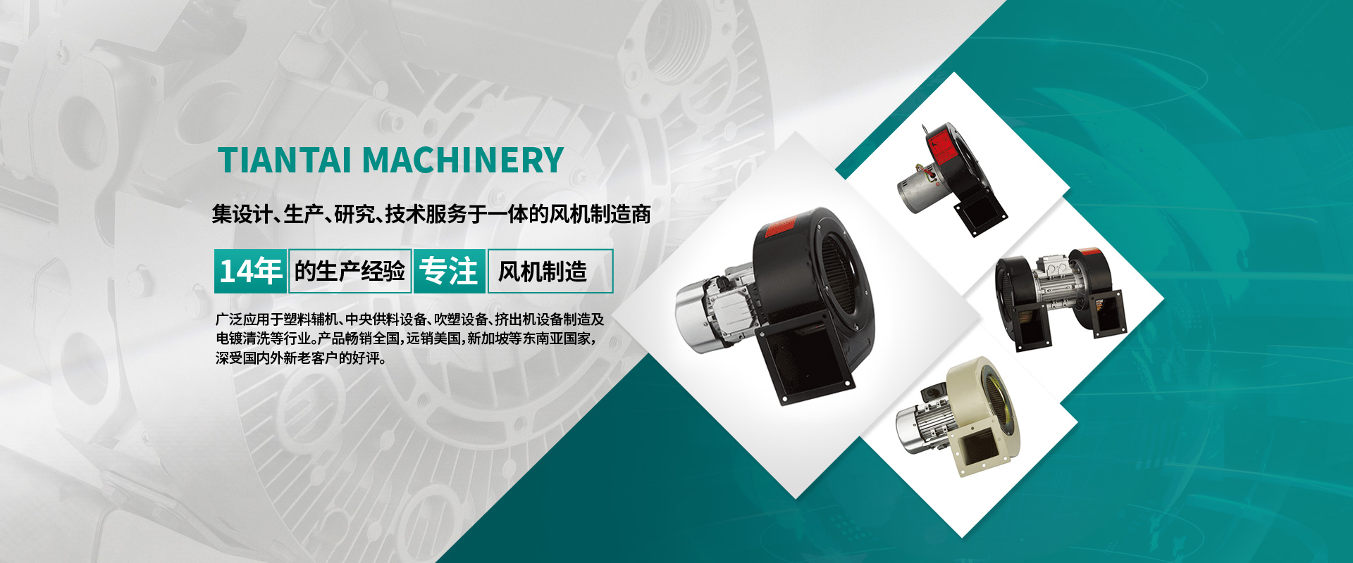 自成立以來,公司不斷引進新設備,新技術,擁有一批行業資深的工程師投入產品的開發與研究,對產品質量進行嚴格的監控,天泰機械有限公司自主開發生產的“TIANZELU”牌風機廣泛應用于塑料輔機、中央供料設備、吹塑設備、擠出機設備制造及電鍍清洗等行業。產品銷往全國,遠銷美國,新加坡等東南亞國家,深受國內外新老客戶的好評。